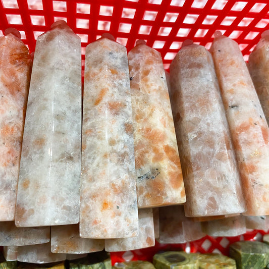 4,5 cm großer Sonnenstein, kleine Doppelspitze, in großen Mengen