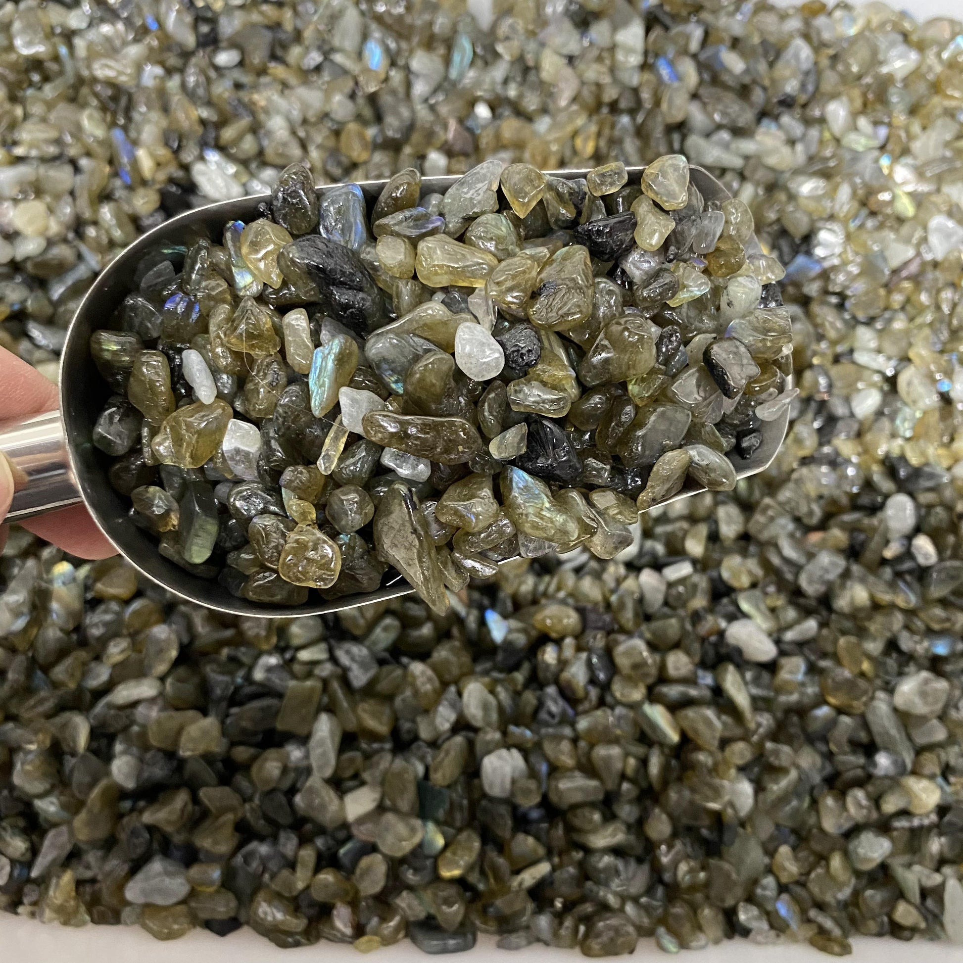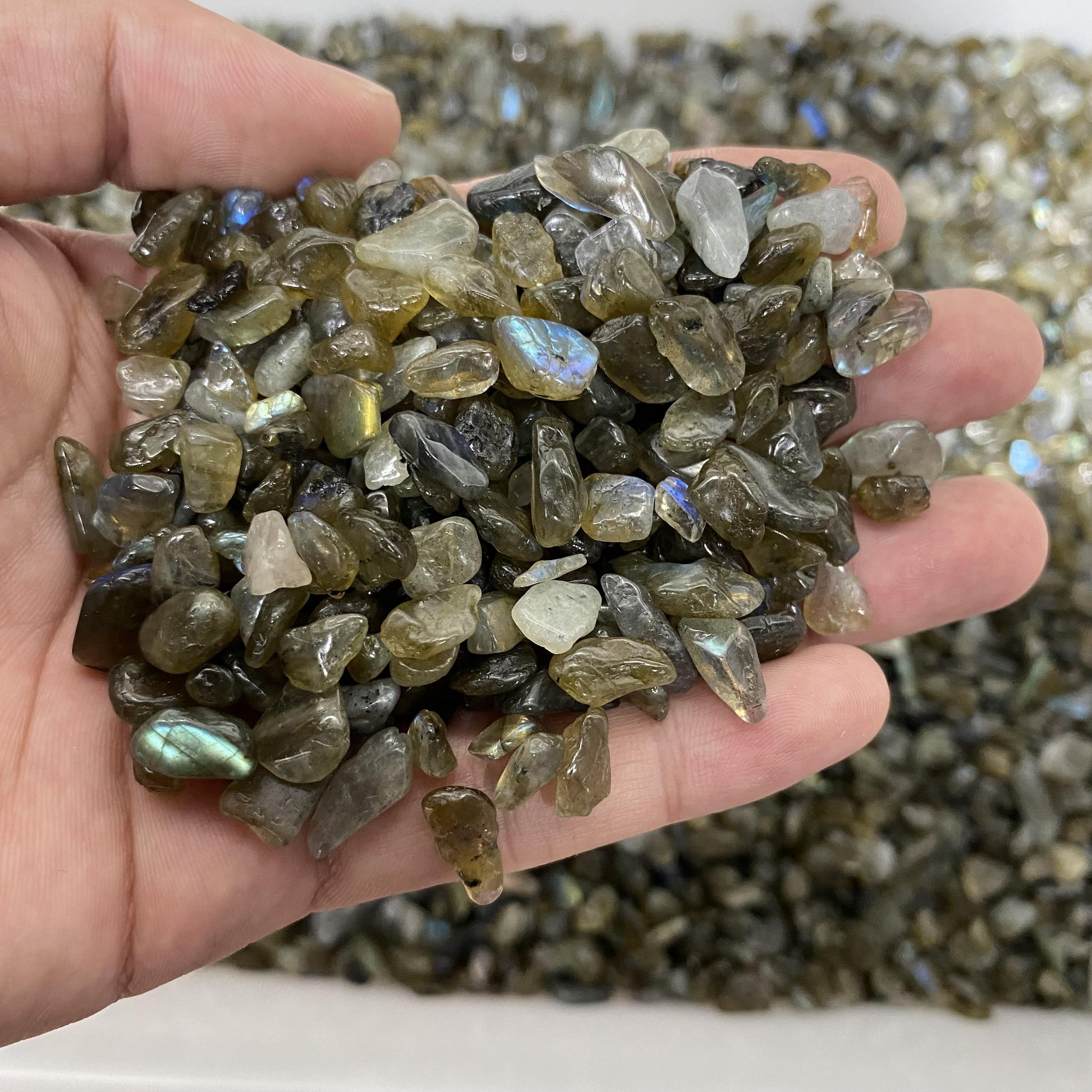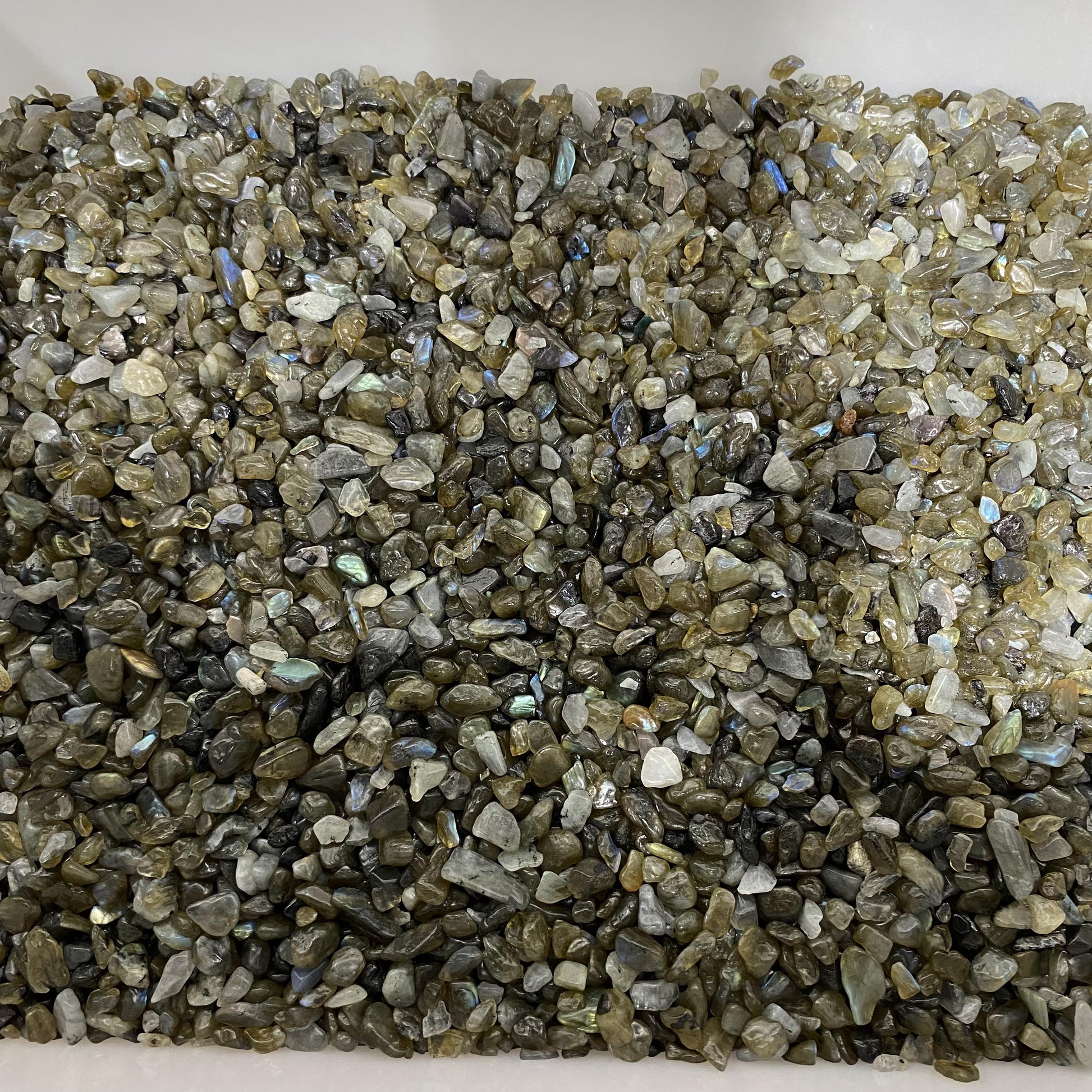 0,5–1,5 cm große zerkleinerte Labradoritsteine in großen Mengen
